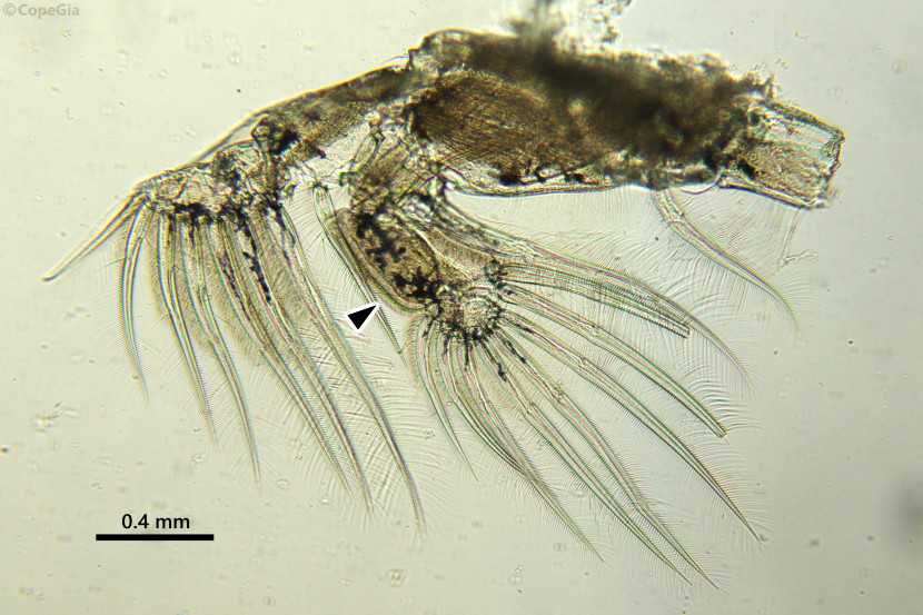 Caligus属は6つのグループに分かれます(記事 No. 28)。今回、採れた個体は、第4胸脚は3節で構成し、末端節に4本の棘(Fig. 2)、第1胸脚の末端節内縁に3本の羽状刺毛(plumose setae)(Fig. 3)、第2胸脚内肢の第2節の内縁に大きな小歯が並ばない(Fig. 4)ことで、C. pseudorhombi groupだと分かりました。