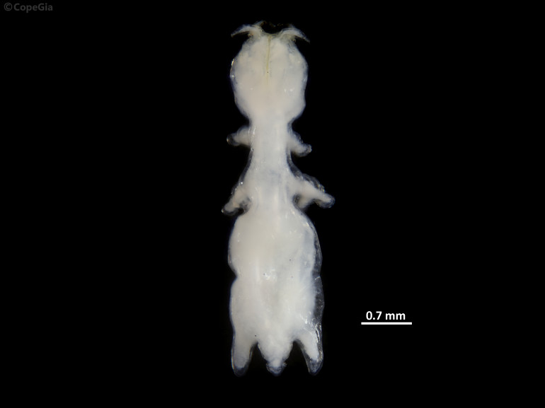 体長(後縁の突起は除く、頭部先端から尾肢後端までの長さ;Fig. 4に後縁の突起を示す)は7.46 mmで、報告にある体長5.03 mmと比較すると大きいです(Shiino 1964)。頭部腹側には大顎~顎脚でなる口器があります(Fig. 2)。大顎は口唇で覆われ確認は難しいです。大顎には円形に並んだ咀嚼歯があるそうです(Ho 1970)。